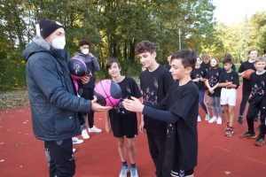 Bonn, 28. Oktober 2021. Ab nach draußen: Im Rahmen der Baskets Sportstunde trainierten die Telekom Baskets Bonn gestern mit 28 Schüler*innen der 8. Klassen der Marienschule in Euskirchen. Da die Sporthalle aufgrund der Flutkatastrophe noch nicht nutzbar ist, verlegten die Baskets das Training bei bestem Herbstwetter nach draußen an die frische Luft. Unter Leitung des Coaches Adrian Kovács zeigten die Spieler Karsten Tadda, Skyler Bowlin und Marek Mboya Kotieno den Kids Tipps und Tricks im Umgang mit dem Basketball. Anschließend gab es Fotos und T-Shirts sowie drei unterschriebene Basketbälle. Als besondere Überraschung luden die Baskets die teilnehmenden Schüler*innen samt ihrem Sportlehrer Carsten Heuser zum Heimspiel am 06. November in den Telekom Dome ein. Das gemeinsame Basketballtraining fand im Rahmen des Sportförderprojekts Baskets Sportstunde statt. Seit nunmehr acht Jahren begeistern die Deutsche Telekom und die Telekom Baskets Bonn damit den Nachwuchs für Bewegung und sportliche Aktivität.