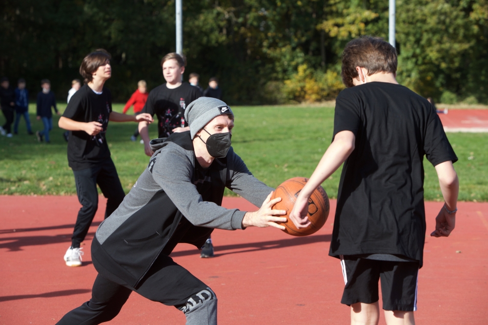 Bonn, 28. Oktober 2021. Ab nach draußen: Im Rahmen der Baskets Sportstunde trainierten die Telekom Baskets Bonn gestern mit 28 Schüler*innen der 8. Klassen der Marienschule in Euskirchen. Da die Sporthalle aufgrund der Flutkatastrophe noch nicht nutzbar ist, verlegten die Baskets das Training bei bestem Herbstwetter nach draußen an die frische Luft. Unter Leitung des Coaches Adrian Kovács zeigten die Spieler Karsten Tadda, Skyler Bowlin und Marek Mboya Kotieno den Kids Tipps und Tricks im Umgang mit dem Basketball. Anschließend gab es Fotos und T-Shirts sowie drei unterschriebene Basketbälle. Als besondere Überraschung luden die Baskets die teilnehmenden Schüler*innen samt ihrem Sportlehrer Carsten Heuser zum Heimspiel am 06. November in den Telekom Dome ein. Das gemeinsame Basketballtraining fand im Rahmen des Sportförderprojekts Baskets Sportstunde statt. Seit nunmehr acht Jahren begeistern die Deutsche Telekom und die Telekom Baskets Bonn damit den Nachwuchs für Bewegung und sportliche Aktivität.