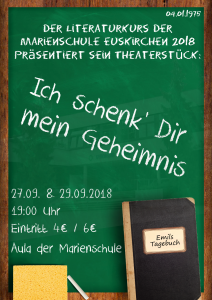 Am Donnerstag, dem 27. September 2018, steigt in der Aula der Marienschule eine ganz besondere Premiere: Nicht nur, dass der diesjährige Literaturkurs sein Stück „Ich schenk Dir mein Geheimnis“ zu ersten Mal aufführt, nein, es handelt sich sogar um eine Weltpremiere, denn das Stück erlebt seine Uraufführung: Die Schülerinnen und Schüler des Kurses haben dieses Stück vollständig selbst geschrieben!